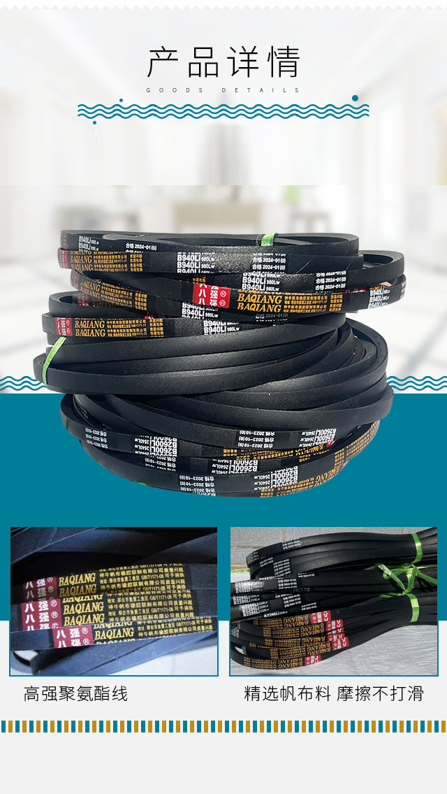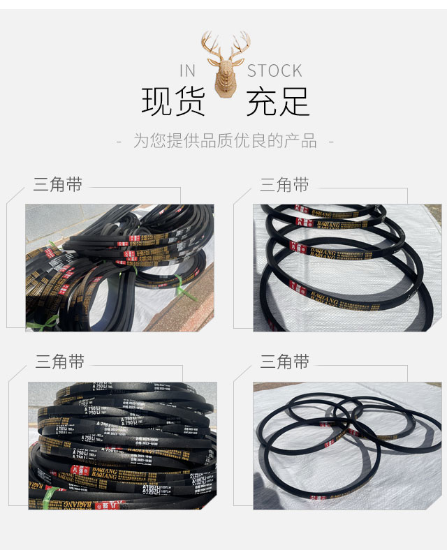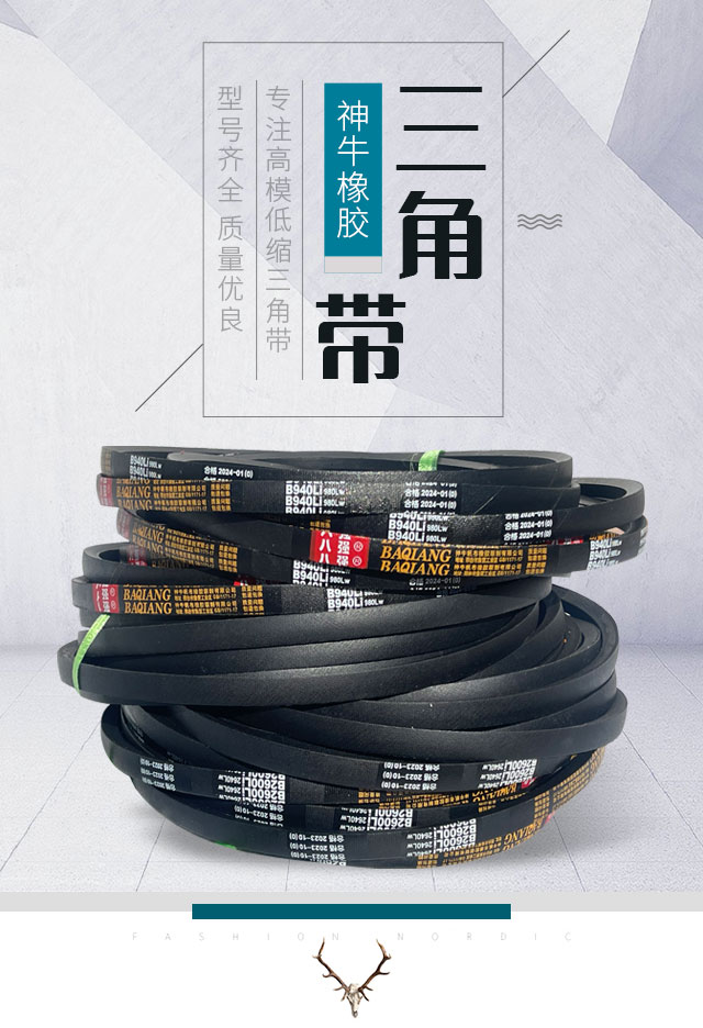 巨鹿县神牛帆布橡胶联制有限公司专注生产各种规格的三角带、包布V带等。主要型号有:A型、B型、C型、D型、E型、SPA、SPB、SPC、5V、8V型等,以联组带。本公司专注高模低缩三角带,不伸长、不打滚、不断胶、抗老化抗磨损、适应工农业机械使用。